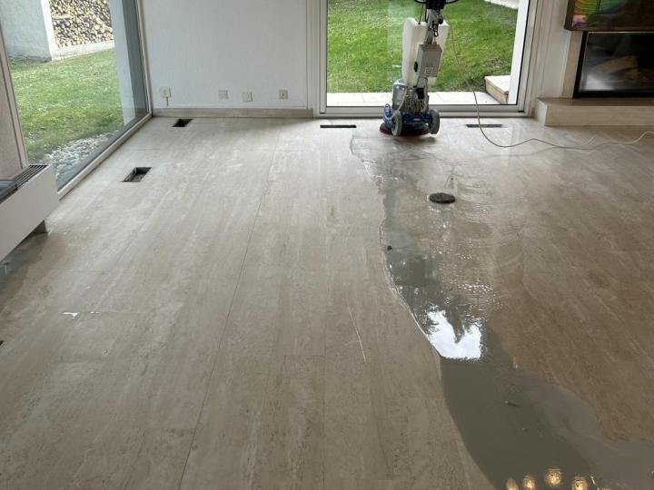 Pour réussir une réelle rénovation durable, il convient d’aller chercher, par ponçage, le cœur de la matière, la densité originelle, d’éliminer la "pierre ponce" de surface, donc de descendre le plus profondément possible (quelque 10°), même si en apparence, le sol n’est pas rayé.